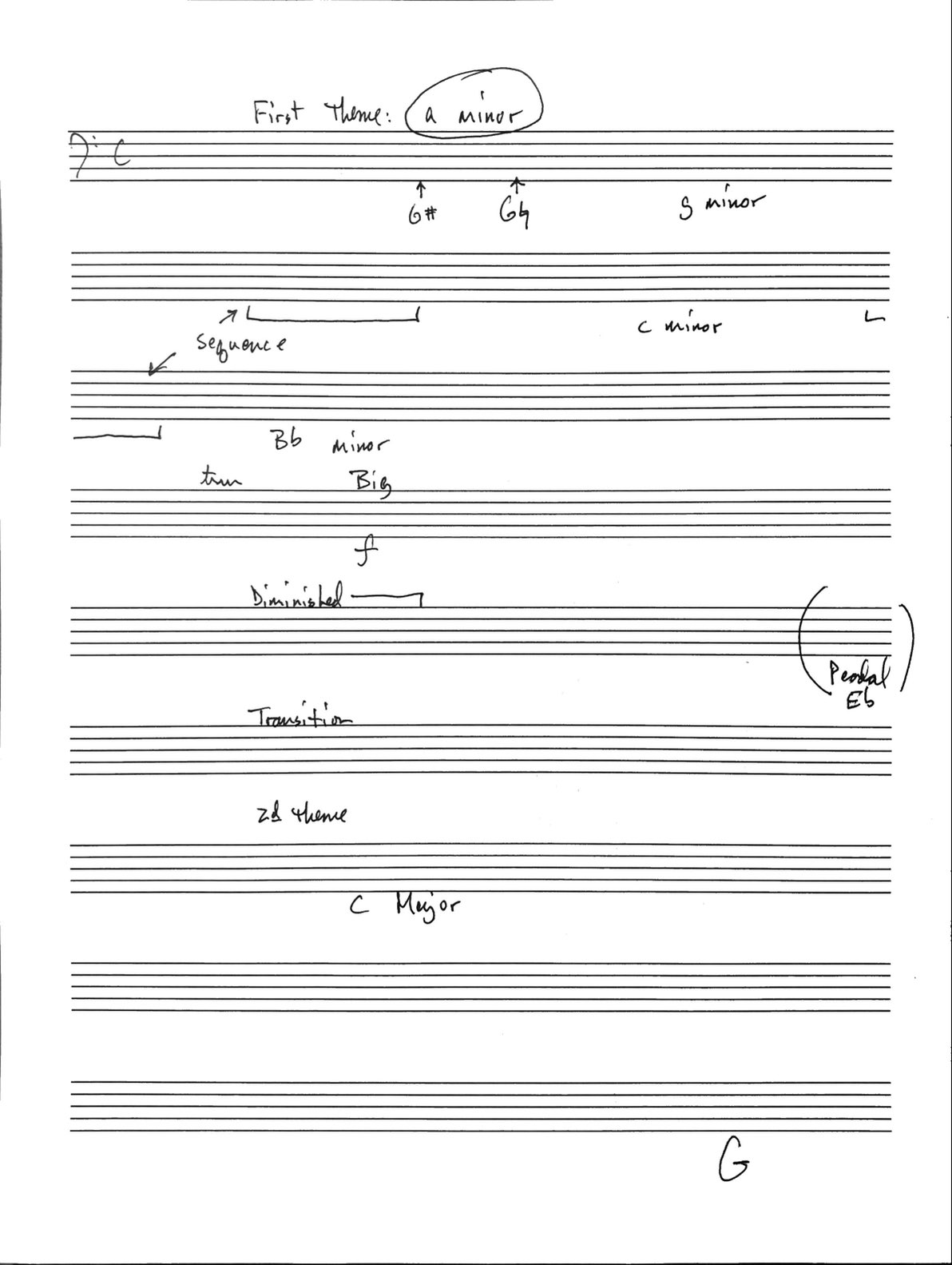 Next, write out your analysis without the music using blank manuscript paper. Use paper that has the same number of staves as the original so your cues will be in the same spot on the page (that’s visual memory!). Here is a link where you can print some blank manuscript paper.